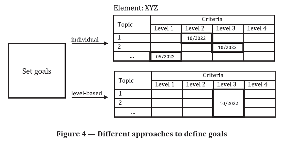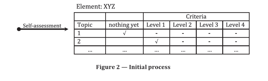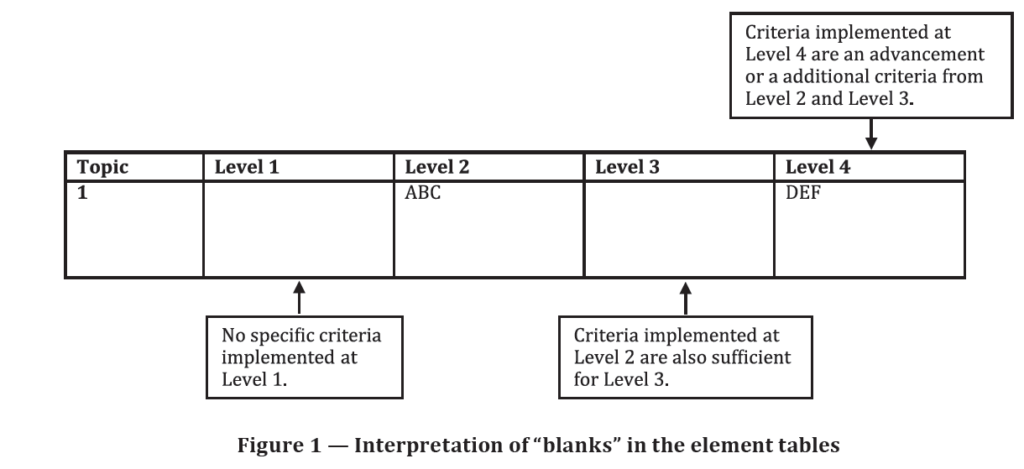 Уровень определенного пункта элемента считается достигнутым, когда выполнены все критерии на этом уровне для него. Достижение определенного уровня определенного элемента требует, чтобы все критерии более низкого уровня были выполнены.
