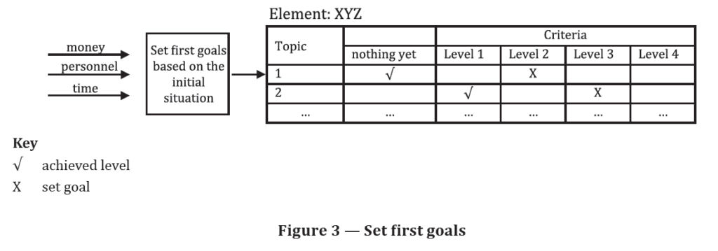 Каждый уровень соответствует возрастающей прогрессии каждому критерию. Первым шагом является определение желаемого уровня каждого пункта. Прежде чем ставить цель, необходимо убедиться, что ресурсы, такие как деньги, время и персонал, доступны для выполнения желаемого уровня элемента и будет ли это выгодно для организации. Этот процесс представлен рисунке 3.