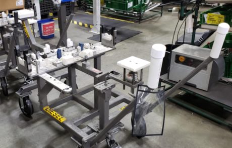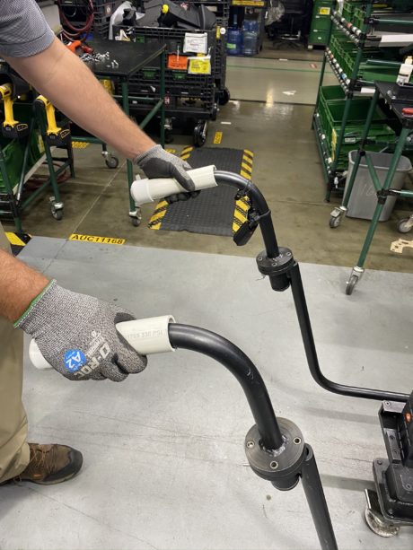 Для решения проблемы был один выход – полностью отказаться от использования ручных тележек и внедрить более сложные и дорогие технологии. Однако команды по бережливому производству попытались придумать альтернативу. Так инженер Джейсон Шеррон придумал ручки безопасности для личного пользования (сокращенно PUSH от “Personal Use Safety Handles”). Делаются они из простой ПВХ трубы с небольшим приспособлением от проскальзывания.