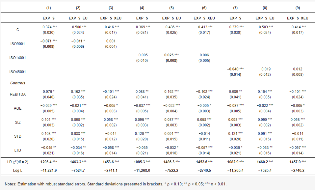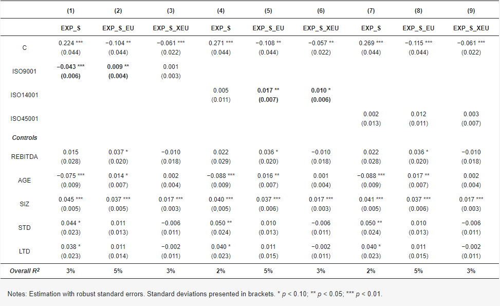 Результати регресії для моделі з випадковими ефектами представлені в таблиці 2, де різні залежні змінні обробляються для змінних «сертифікація ISO» (ISO9001, ISO14001 і ISO45001), а контрольні змінні REBITDA, AGE, SIZ і борг (СТД і LTD). У перших трьох колонках представлені результати вивчення взаємозв’язку між сертифікацією ISO 9001 та експортом, тоді як у колонках з 4 по 6 та з 7 по 9 відповідно розглядаються стандарти ISO 14001 та ISO 45001/18001.