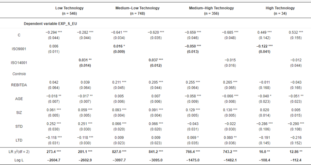 Результати моделі Тобіт у таблиці 3 лише частково підтверджують результати попередніх регресій. Позитивний зв’язок між ISO 9001 та інтернаціоналізацією зникає, виявляючись лише як значний позитивний зв’язок для ISO 14001 та експорту до ЄС. Цей останній результат також отримано з огляду на більш екологічно свідомі європейські ринки порівняно із середнім світовим показником. Розмір фірми зберігає свій позитивний вплив, а довгострокова заборгованість також демонструє значний негативний зв’язок. Таким чином, зв’язок між сертифікацією та інтернаціоналізацією стає менш зрозумілим, що мотивує наш наступний аналіз на галузевому рівні.