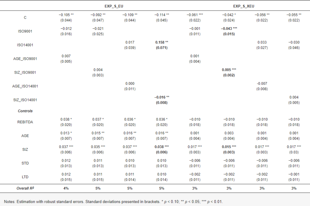 Результати Таблиці 5 свідчать про наявність стримуючого ефекту розміру фірми у відносинах між сертифікацією та інтернаціоналізацією. Розмір фірми був визнаний фактором, що впливає на прийняття сертифікації. Цікаво, що позитивний зв’язок між розміром та експортом до країн ЄС підкріплюється наявністю сертифікату ISO 14001. Таким чином, великі фірми-експортери, схоже, отримують вигоду від екологічної сертифікації при експорті на ринки ЄС. Ми можемо стверджувати, що переваги, які приносить розмір фірми для інтенсивності експорту, посилюються, коли фірми сертифіковані, що сприяє кращому позиціонуванню фірми на ринках ЄС. Цей результат має чітке політичне значення: рекомендувати та підтримувати сертифікацію ISO 14001 для португальських середніх фірм, які намагаються експортувати до ЄС. Щодо сертифікації ISO 9001, здається, що позитивний вплив розміру фірми на експорт зменшується через наявність цієї сертифікації. Цей розмірний ефект заслуговує на більшу увагу в майбутніх дослідженнях.