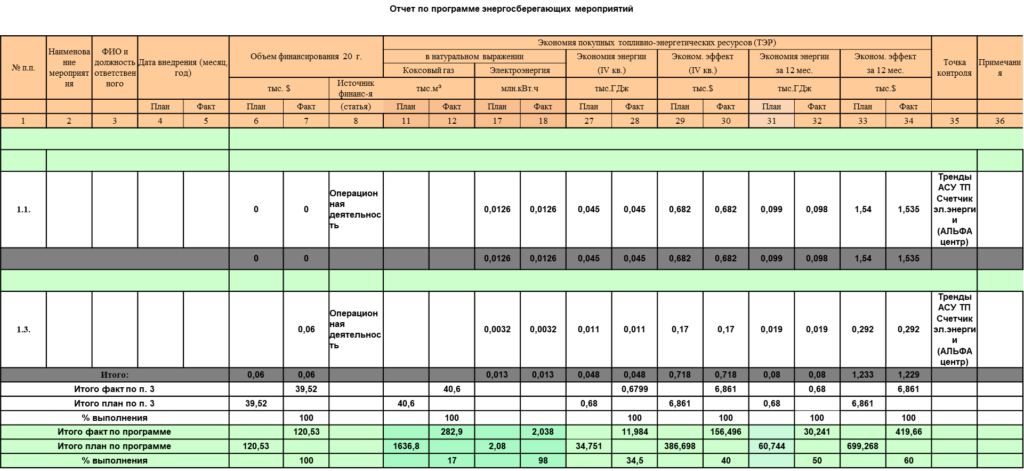 Саме цей документ надає можливість “ДОТРКНУТИСЬ” до конкретних результатів використання інструменту – енергоефективності. Його впровадження в організаційну практику вирізняється можливістю відстеження фінансової вигоди від реалізації та використання цього стандарту менеджменту. Зазначимо це в контексті можливостей побачити реальні фінансові вигоди, що випливають із застосування даної програми, і це робить її унікальною серед інших менеджмент-стандартів. Далі наведено приклад програми та звіту за нею на рисунках нижче.
