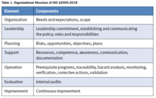Як і всі стандарти ISO, ISO 22000 періодично переглядається, щоб переконатися, що він відображає поточні процеси мислення щодо безпечності харчових продуктів. Однією з причин перегляду стандарту було приведення стандарту у відповідність з іншими стандартами ISO шляхом включення елементів структури високого рівня (HLS). Це гарантувало, що мова та стандартний формат були єдиними. Серед змін, включених до ISO 22000:2018, є формулювання, яке більше відповідає документу Codex HACCP, а також підкреслює різницю між операційним ризиком (тобто традиційним HACCP) і загальним організаційним ризиком (тобто управлінськими рішеннями щодо уникнення ризику). В додаток, версія 2018 року вводить концепцію операційних програм передумов і вимагає від компанії продемонструвати, що вона ефективно використовує результати діяльності з моніторингу та перевірки. Короткий виклад організаційної структури ISO 22000:2018 наведено в таблиці 1.