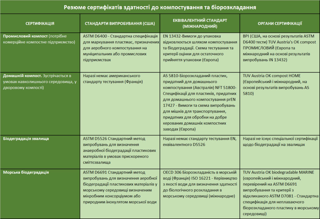 Коли продукт пройде тестування, результати можна надіслати сторонній організації для сертифікації. У всьому світі існує безліч сторонніх сертифікаторів. У США найвідомішим є Інститут біорозкладаних продуктів , або BPI. У Європі найвідомішим органом управління є TÜV Austria. Сертифікація компосту OK compost INDUSTRIAL , яка є еквівалентом сертифікації BPI в Америці. Компанія TIC Ukraine, як офіційний представник TUV Austria на території України проводить сертифікацію відповідно до вимог EN 13432. Тому, перевіряючи продукт, який можна компостувати промислово чи комерційно, зверніть увагу на логотипи ASTM D6400, EN 13432, BPI та TUV Industrial. Продукти, позначені цими логотипами, є сертифікованими для компостування , і ви можете бути впевнені, знаючи, що якщо ви утилізуєте їх належним чином, вони проживуть повністю циклічний життєвий цикл.